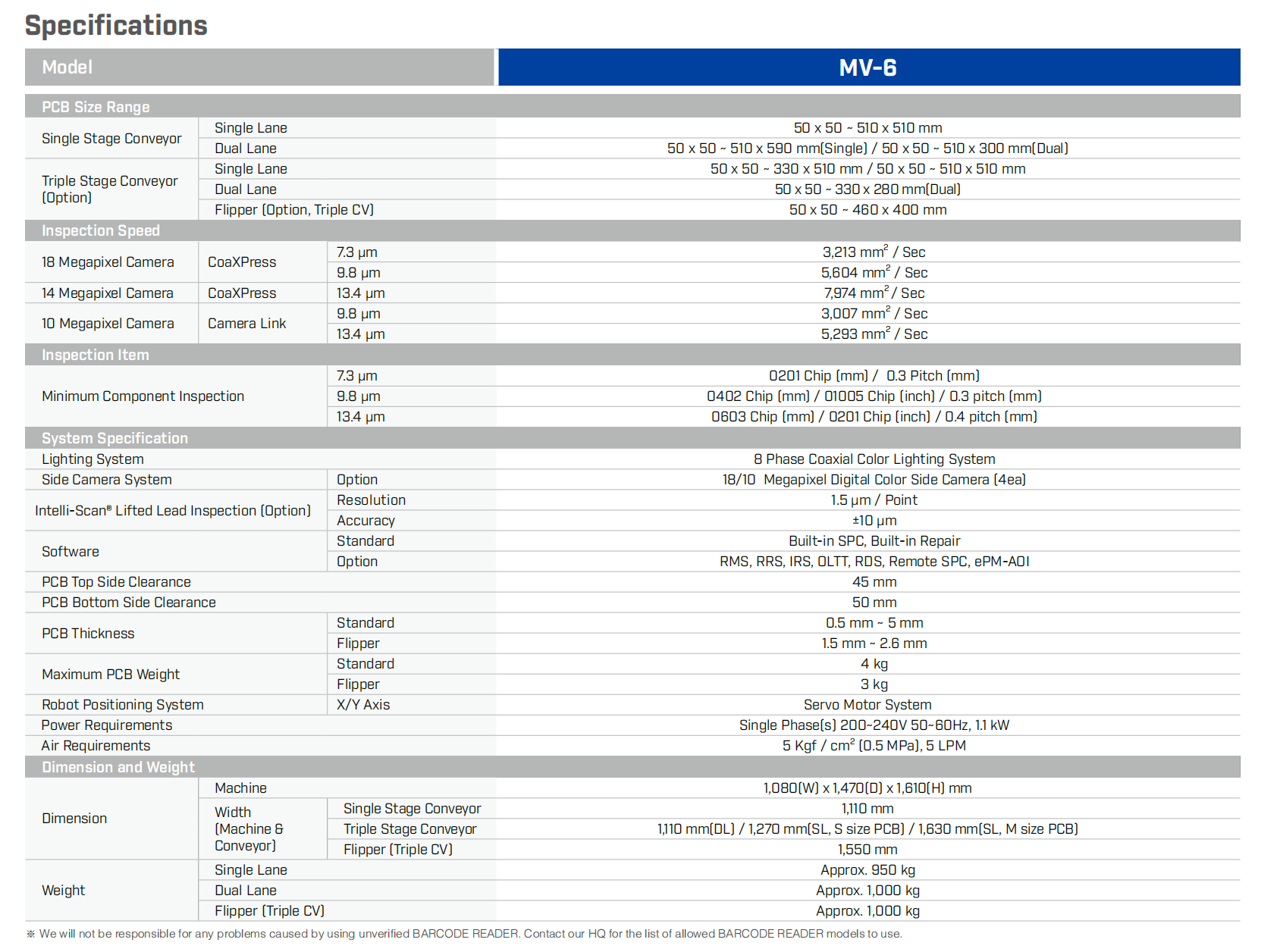 MV-6 series is a AOI product which can be used as two types mounting/solder. It is an inline vision inspector with 18 Megapixel camera, laser scan, 18 Megapixel side cameras and 8 phase coaxial color lighting system applied to give optimal results to various production processes.