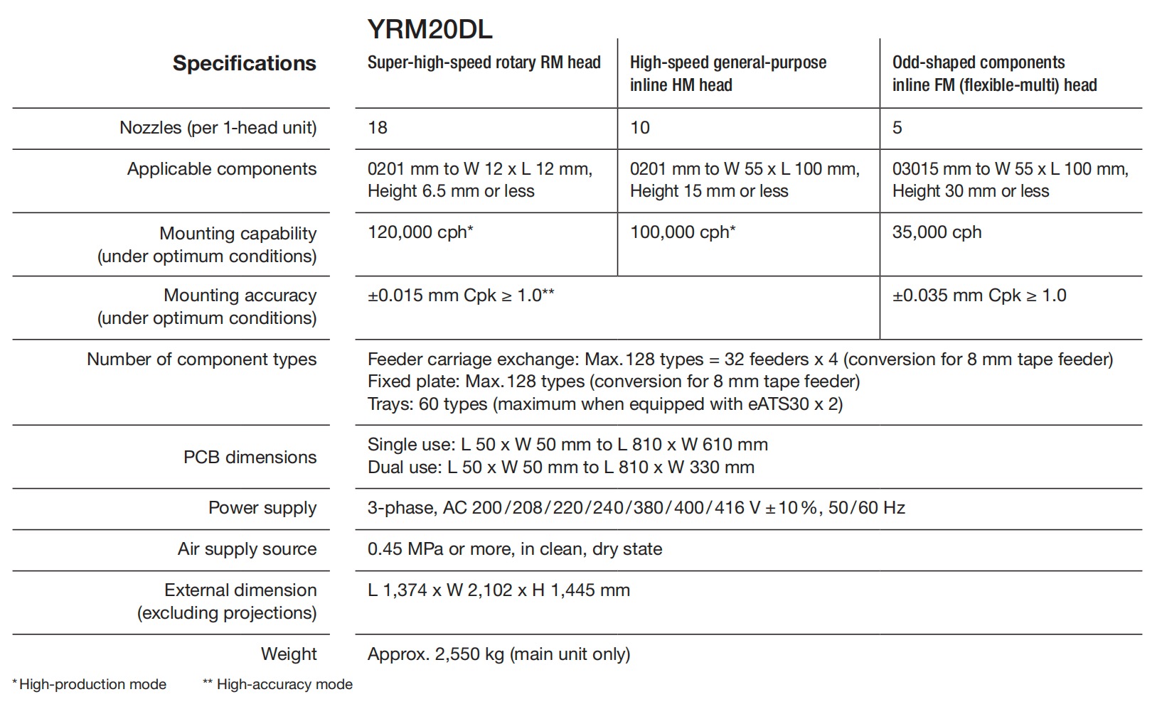 Rotary head boosts mountability of tiny components. This maintains high-speed production since head replacements are no longer needed. This technology helps carry on the 1-head solution concept. This head can handle components ranging from super tiny 0201 mm components up to medium-sized odd-shaped components of 12 x 12 mm dimensions with heights of 6.5 mm.