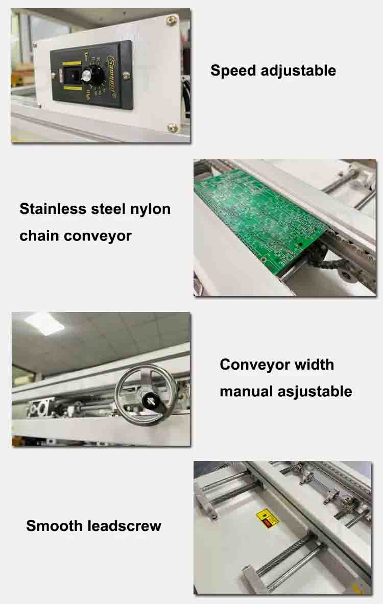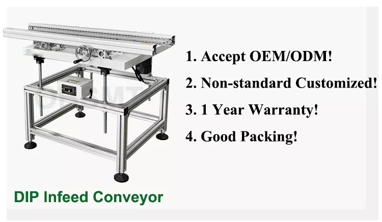 Wave solder infeed conveyor, it is used to feed PCB’s or pallets into wave soldering machine at 6-7°. conveyor width and angle can be adjusted by hand crank. Special belt and track, transmission smooth, and work stable and reliable.
