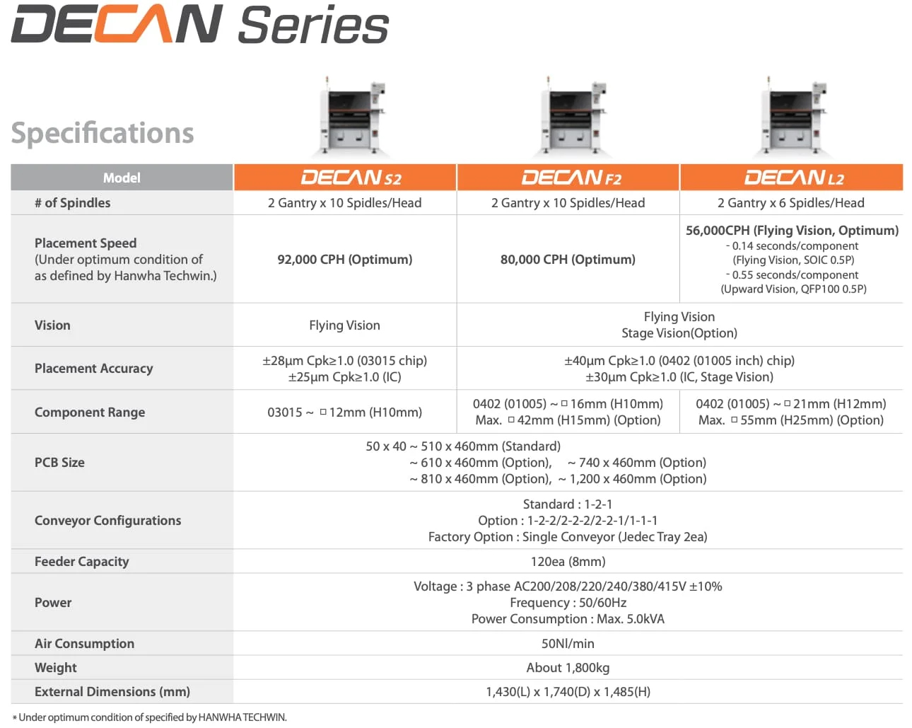 he Hanwha Decan F2 is a high-performance pick-and-place machine specifically designed for the most demanding Surface Mount Technology (SMT) assembly applications. It combines advanced technology, high-speed precision, and adaptability to deliver excellent performance in high-volume production environments. The Decan F2 is built to handle diverse component types and a wide range of production needs, making it suitable for industries such as automotive electronics, consumer devices, telecommunications, and more.
